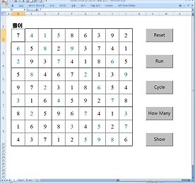 Sudoku 썸네일형 리스트형 스도쿠 100개 풀기 이 동영상은 아래의 프로그램을 이용해서 어떤 스도쿠 책에 있던 Hard 난이도 100문제를 풀어보는 것입니다. Hard난이도 라고 하지만 아래의 예제보다 쉽습니다. 모든 스도쿠에 대해서 풀 수 있는지 테스트하기 위해 만들 것이고 제 생각으론 이론상으로 모든 스도쿠를 풀 수 있으나 일부 극악한 경우 풀이를 마칠때까지 시간이 많이 걸릴 수 있습니다. 다른 분이 만든 스도쿠를 참조하면서 다음에 포스팅 하겠습니다. 더보기 스도쿠 엑셀로 풀기 제가 만든 스도쿠 프로그램입니다. 힘들게 만들었고 꽤 오래전에 만들었는데 잘 돌아가기는 하지만 지금 소스를 보면 이렇게 발로짠 소스가 있나 하고 생각될 정도입니다. 나중에 다시 최적화시켜서 다시 올려보겠습니다. 1. 우선 스도쿠 문제를 오른쪽 문제 부분에 넣습니다. 참고로 아래 문제는 엄청나게 어려운 문제입니다. 사람이 풀기엔 좀 어렵습니다. 간단한 걸 넣으면 너무 빨리 풀어버려서 어려운 문제로 넣어놨습니다. 2. Reset 버튼을 누르면 문제부분이 풀이부분에 복사됩니다. 3. How Many버튼을 누르면 각 칸에서 가능한 경우의 수와 가능한 숫자들을 보여줍니다. 아래화면에서 좌상단 첫번째 칸은 두개의 경우의 수가 있고 7과 9가 가능하다는 것입니다. 4. 풀이를 마친 화면입니다. 문제에 들어있던 숫자는.. 더보기 이전 1 다음